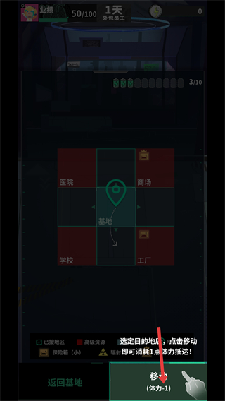 3、選定目的地后,點擊移動體力減1,消耗體力抵達目標區域,可選擇醫院、商場、學校、工廠等地點,不同區域資源類型與數量有所差異。