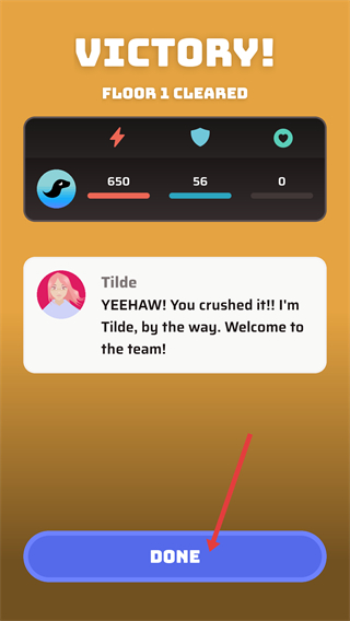 4、通關第一層后點擊DONE查看戰斗數據和劇情對話,解鎖新角色到入隊伍為后續冒險做準備。