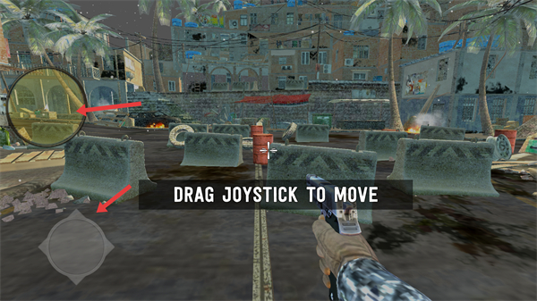 2、游戲中通過拖動左下角的虛擬搖桿來控制角色移動,同時可留意左側的放大鏡區域以便觀察遠處情況。