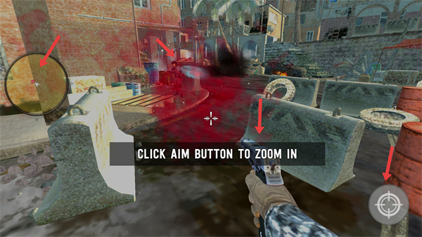 3、遇到敵人時點擊右下角的瞄準按鈕可放大視野,便于精準瞄準敵人此時要注意利用周圍掩體躲避敵人攻擊。