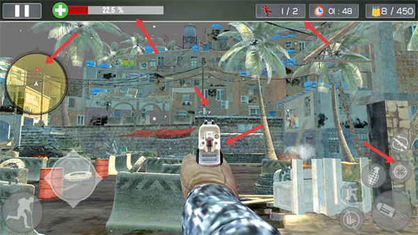 4、戰斗時需關注上方的生命值、剩余敵人數量、時間以及彈藥量利用右側的瞄準等功能按鈕,結合左側小地圖尋找敵人及時消滅敵人完成任務。