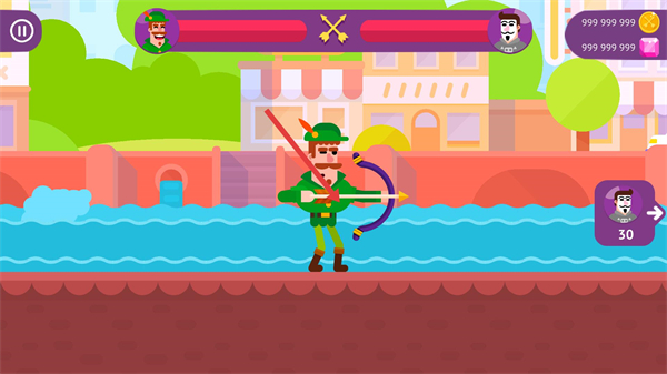 1、操控角色如綠衣弓箭手,瞄準并發射弓箭,攻擊敵方角色如戴面具的對手,削減其血量。