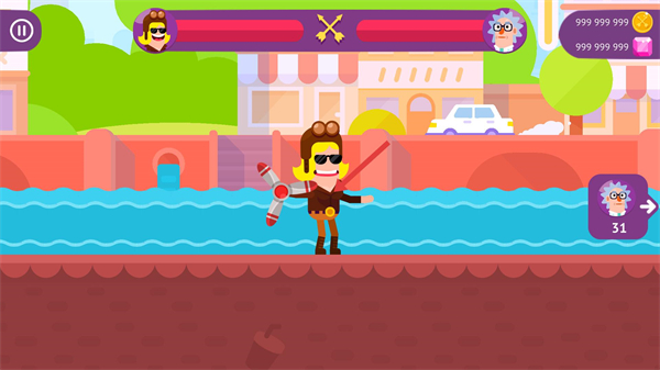 3、切換不同角色如飛行員裝扮角色,利用其專屬武器如螺旋槳武器,攻擊新的敵方角色如戴眼鏡的對手,體驗多樣戰斗方式。