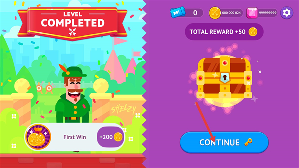 4、完成關卡后,點擊CONTINUE繼續游戲,可領取金幣獎勵如50金幣,積累資源用于角色或裝備升級。