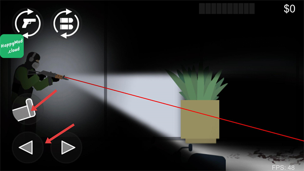 3、在游戲中利用左側操作按鈕,切換武器如手槍、移動角色,瞄準并射擊僵尸,清理區域,完成防御任務。