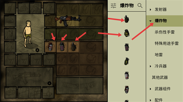 2、選擇爆炸物分類將手雷等爆炸物裝備到角色的對應格子中,根據戰斗需求搭配不同類型的爆炸物為戰斗提供火力支援。
