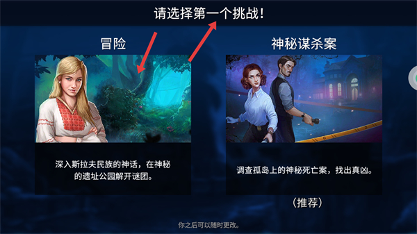 1、游戲開始時可選擇冒險或神秘謀殺案挑戰,冒險挑戰深入斯拉夫民族神話在遺址公園解謎,神秘謀殺案調查孤島死亡案找真兇可根據喜好選擇。