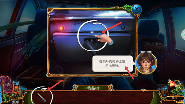 4、在損壞的車門把手上使用指甲銼從物品欄中選取指甲銼,按照提示操作解決車門把手的問題為逃離汽車創造條件。