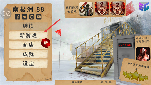 1、在游戲主界面可選擇新游戲開啟冒險也可進入商店、查看成就、調整設定,根據需求選擇功能開啟南極洲88的生存挑戰。