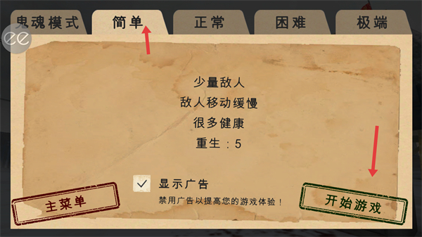 1、在難度選擇界面可選擇簡單模式開始游戲,該模式敵人少、移動慢、玩家健康多且有5次重生機會設置好后點擊開始游戲開啟冒險。