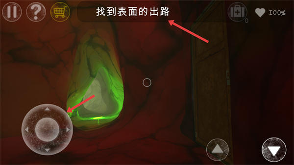 2、在場景中利用左側虛擬搖桿移動目標是找到表面的出路,留意周圍環境中的通道和線索朝著綠色光亮區域推進尋找逃離的路徑。