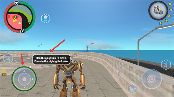 1、游戲中使用左側虛擬搖桿移動角色按照提示進入高亮區域,同時留意小地圖的指引探索周圍環境開啟機器人冒險之旅。