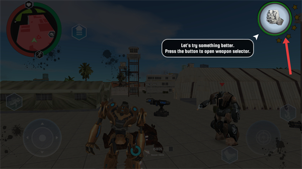 2、遇到敵方機器人時按住右側拳頭按鈕進行近戰攻擊,擊敗機器人以繼續推進注意攻擊的時機和節奏確保戰斗勝利。