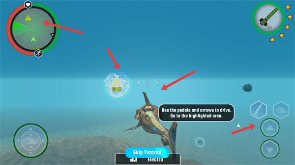 4、在水下場景中使用踏板和方向箭頭駕駛機械鯊魚,按照小地圖的提示前往高亮區域同時留意周圍的水下障礙物和敵人順利完成任務。