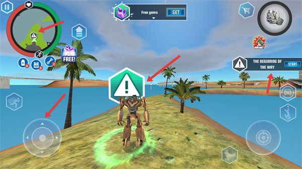 2、在場景中使用左側虛擬搖桿移動根據小地圖和高亮提示區域推進,點擊右側任務開始按鈕開啟任務探索游戲世界。