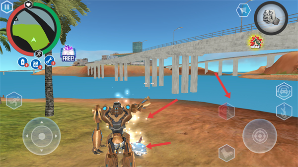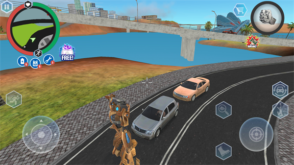 4、在公路場景中操控機器人移,留意過往車輛,可選擇攻擊或躲避根據小地圖的指引前往目標區域推進游戲進程解鎖更多任務和區域。