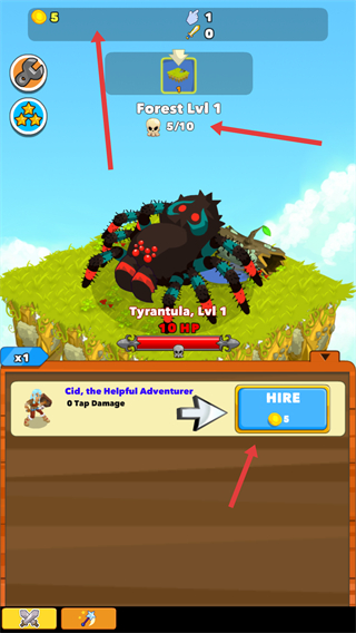 3、遇到Tyrantula時使用積累的金幣雇傭Cid提升攻擊傷害,完成擊殺目標解鎖更多游戲內容。