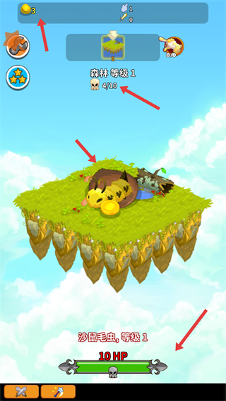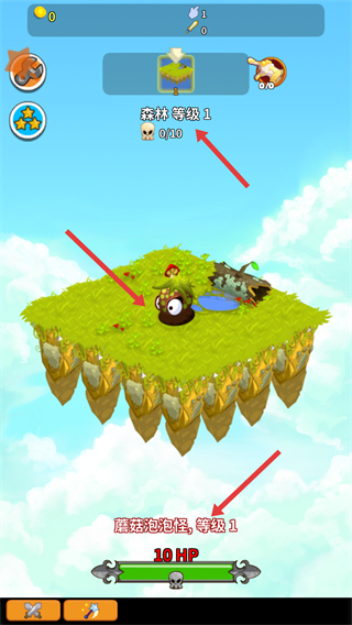 1、在森林等級1場景中攻擊蘑菇泡泡怪它等級1且有10HP,需完成10個怪物擊殺目標。