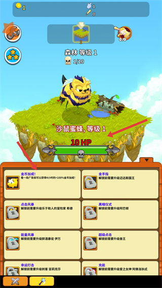 2、擊敗沙鼠蜜蜂后可查看金幣加成等功能,同時繼續擊殺怪物,推進森林等級1的擊殺進度。