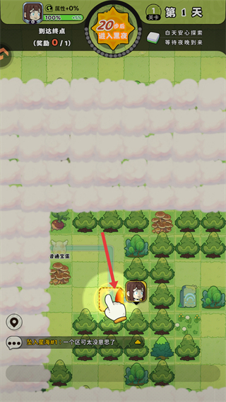 3、按照提示移動角色白天安心探索,注意20步后進入黑夜的提示逐步推進收集獎勵向終點前進。