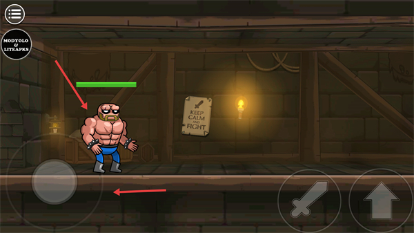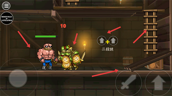 3、遇到敵人時可使用右下角的攻擊鍵戰斗,同時要掌握二段跳技能連續按兩次跳躍鍵借助道具到達高處。