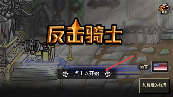 1、點擊點擊以開始按鈕即可進入游戲,界面中有反擊騎士標題和商店入口開始后可開啟游戲旅程。