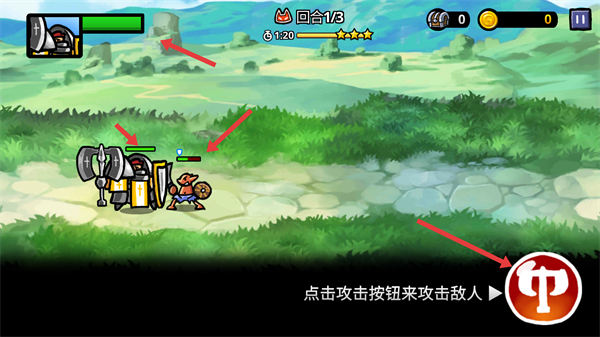 2、進入戰斗后注意回合數、時間和星級,點擊攻擊按鈕攻擊敵人合理發起攻擊,推進戰斗進程。