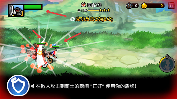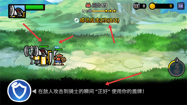 3、戰斗中需完成成功反擊2次的目標,在敵人攻擊瞬間點擊盾牌按鈕使用盾牌既能防御又能觸發反擊,提升戰斗效果。
