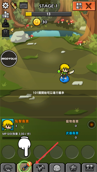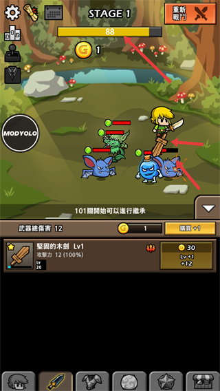 1、在STAGE1中操控角色攻擊多種怪物如哥布林、雞蛋怪等,攻擊時關注金幣數量和關卡進度條逐步消滅怪,積累金幣推進關卡進程。