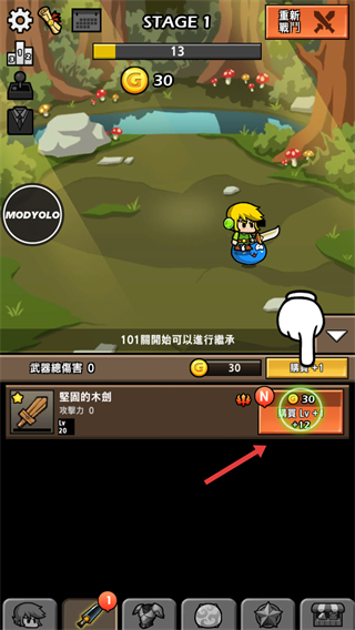 4、升級武器后繼續攻擊怪物利用提升的攻擊力快速消滅敵人推進關卡進度條,關注剩余怪物和金幣數量合理分配資源完成STAGE1的戰斗。