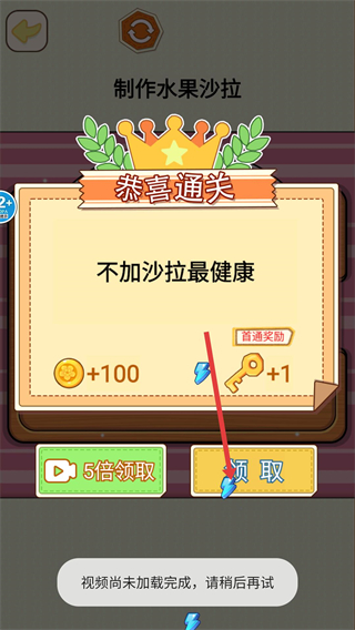 4、通關后點擊領取,獲取獎勵如100金幣、1把鑰匙,用于解鎖新關卡或道具,繼續游戲進程。