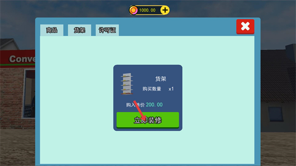 4、在貨架界面花費200購入貨架購買數量1,點擊立即裝修擴充商品陳列空間,為后續上架更多商品做準備。