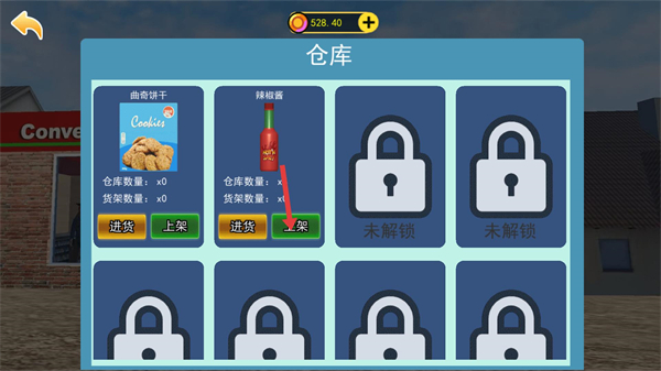 3、進入倉庫界面,對曲奇餅干和辣椒醬先點擊進貨補充庫存,再點擊上架將商品擺上貨架。