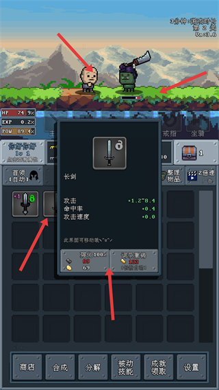 4、獲得新裝備如長劍后可查看其屬性包括攻擊、命中率、攻擊速度等還可對裝備進行強化、洗練詞條等操作提升裝備屬性增強戰斗力。
