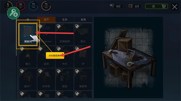 3、再次打開工藝菜單放網獲取食物利用建造好的捕魚網,定期放網捕魚確保有足夠的食物維持生存。