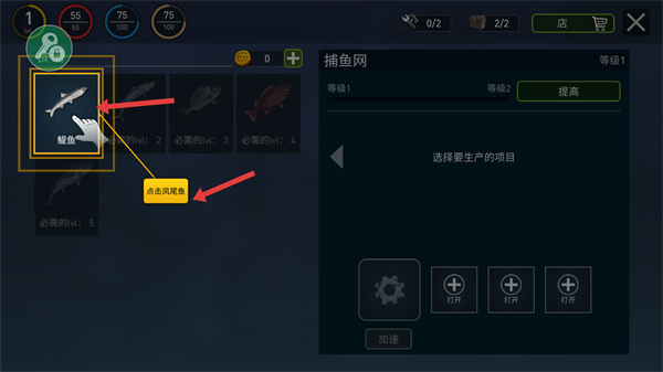 4、在捕魚網界面選擇可捕獲的魚如鳀魚等,根據等級選擇相應的魚進行捕獲提升捕魚網等級可捕獲更多種類的魚豐富食物來源。