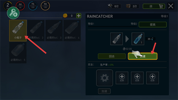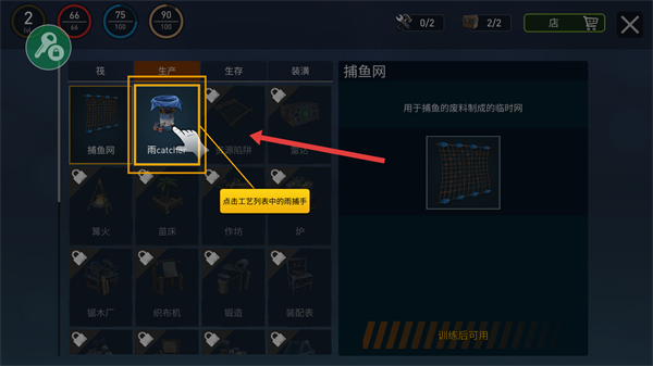 2、在工藝列表中點擊雨捕手建造雨捕手可用于收集雨水獲取飲用水,滿足生存的飲水需求是解決水源問題的重要方式。