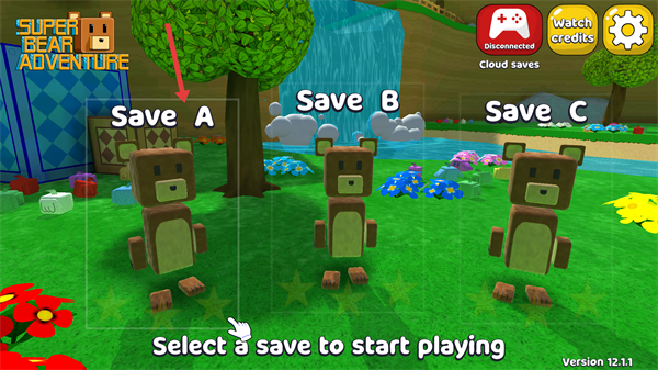 1、選擇存檔SaveA或者SaveB或SaveC開始游戲根據自身需求選擇合適的存檔,進入超級熊冒險的冒險世界開啟探索之旅。