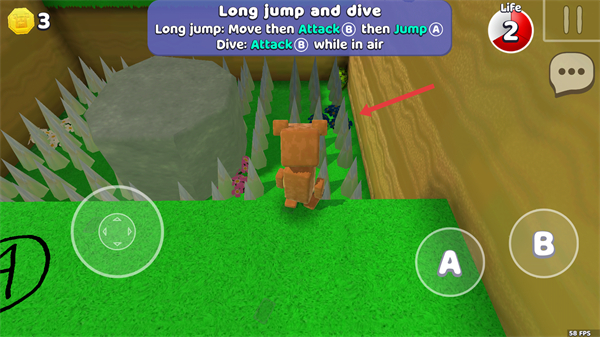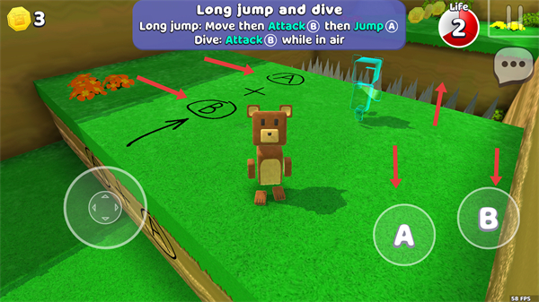 3、掌握長跳和俯沖操作長跳需移動后按B再按A俯沖需在空中按B,利用這些操作跨越障礙躲避尖刺等危險推進游戲進度。