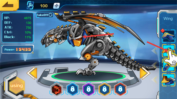 2、在機甲界面可查看機甲的HP、DEF、ATK等屬性,還能通過右側的部件欄更換機甲部件提升機甲戰力。