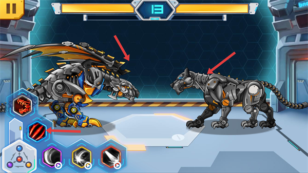 3、戰斗時可使用左側的技能按鈕釋放技能,應對敵方機甲需根據敵方機甲的狀態及時選擇合適技能攻擊。