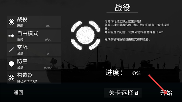 1、在戰役界面點擊開始進入關卡,需通過升級飛機、解鎖模式來推進戰役進度,完成后可解鎖自由模式。
