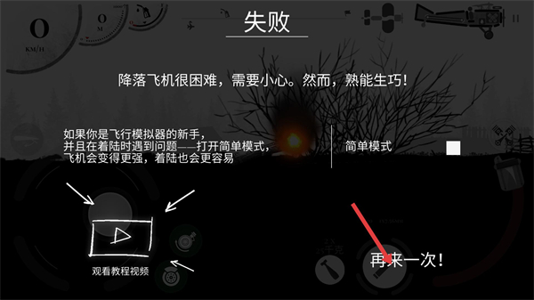 4、降落失敗后點擊再來一次重新挑戰,新手可開啟簡單模式降低難度,也可觀看教程視頻學習操作技巧。