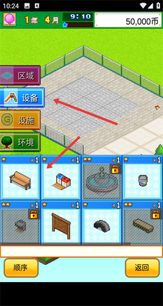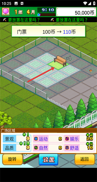3、將選中的設備或設施放置在公園的空地上,通過合理布局來提升公園的各項屬性,吸引更多游客。