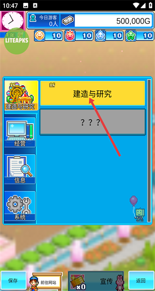 2、在游戲過程中點擊建造與研究選項,進入游樂設備選擇界面,從中挑選合適的游樂設施來布置游樂園。