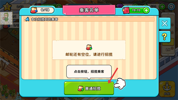 1、點擊普通招攬按鈕可招攬乘客,填充游輪空位為游輪經營提供客源基礎。