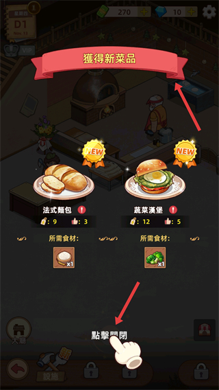 4、獲得新菜品后點擊點擊關閉按鈕,可關閉菜品提示界面,繼續店鋪的經營操作如準備食材制作菜品等。