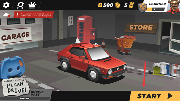 1、進入游戲后注意左上角提示登錄可保存進度,避免丟失車輛、道具等,點擊右下角START開始游戲。