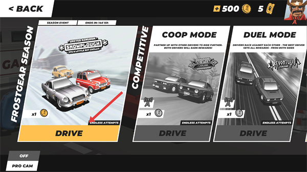 2、在模式選擇界面可參與季節活動FrostgearSeason里的英國雪地活動,還有合作模式和決斗模式,選擇活動后點擊DRIVE參與。