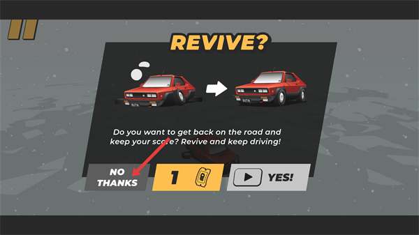 3、游戲中車輛損壞時會出現復活提示可選擇消耗道具、看廣告復活或點擊NOTHANKS放棄復活。